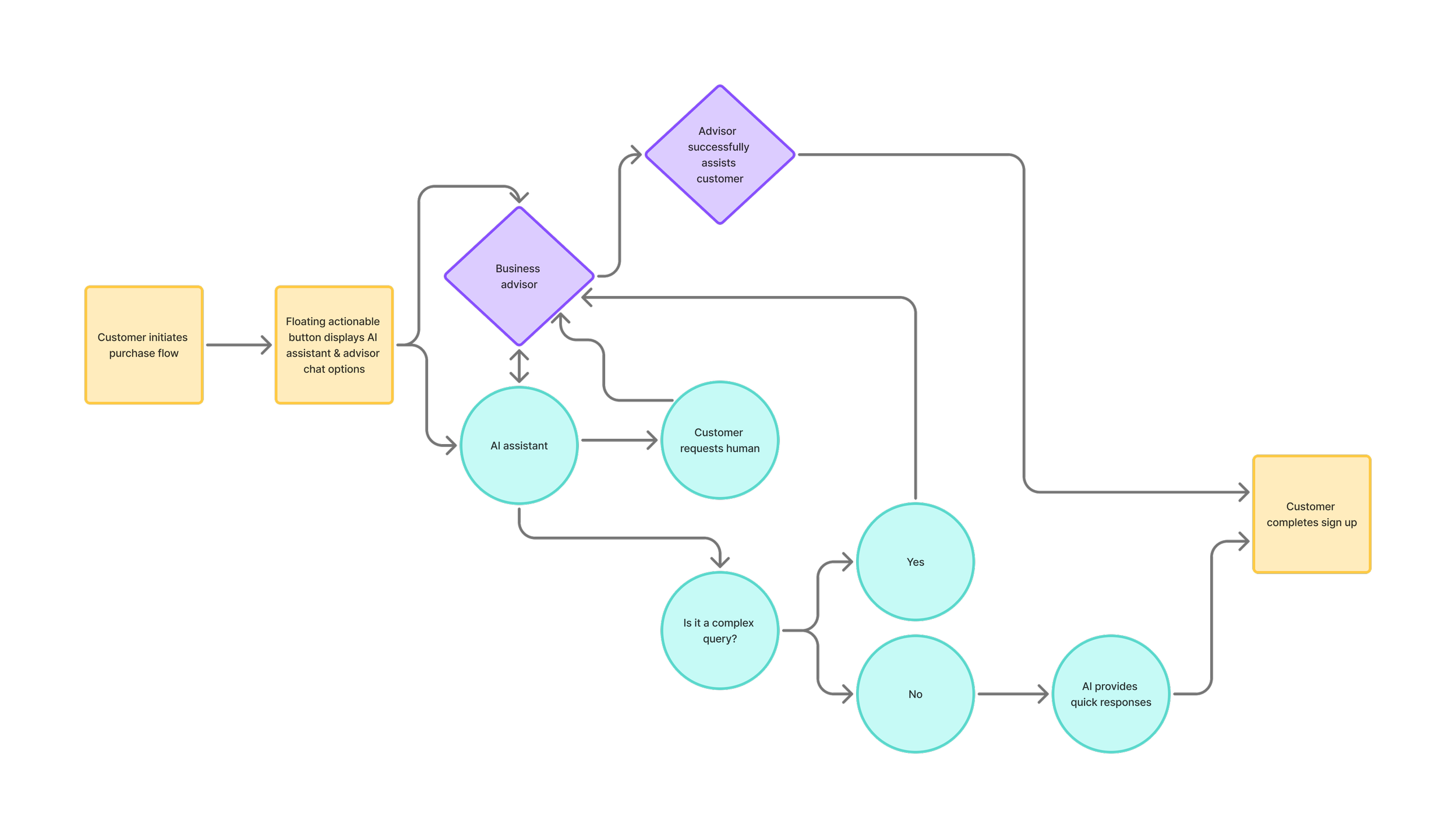 This project explored how to introduce AI-powered assistance and how that could transition to human agent support in a clear and helpful way—ultimately guiding customers to the right resource at the right moment.